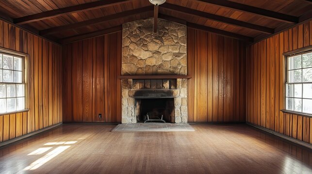 Empty Cabin Room with Stone Fireplace and Wood Paneling