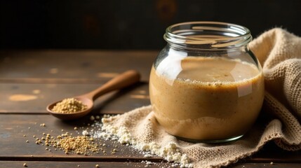 Creamy textured beverage in a glass jar on a rustic wooden surface