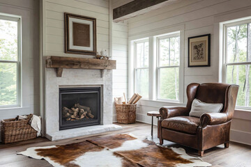 Mockup frame hanging in a cozy farmhouse living room interior, modern, living room, mockup frame, farmhouse
