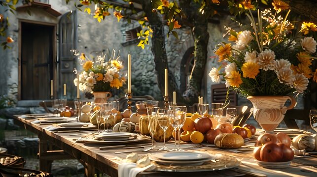 Overhead shot of a rustic wooden table set for a summer brunch with fresh figs, ricotta toast, and wildflower decorations, light shadows falling from surrounding trees