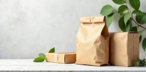 Eco-friendly packaging materials on rustic white backdrop, backdrop, white