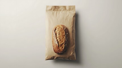 Brown paper packaging standing on wooden table with coffee beans and barista preparing coffee in background