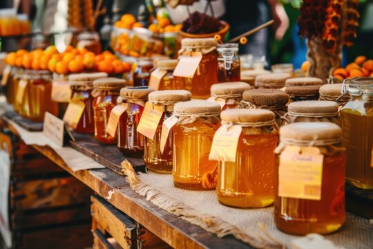 A creative honey display at a craft fair, featuring various jars of honey with rustic packaging and labels.