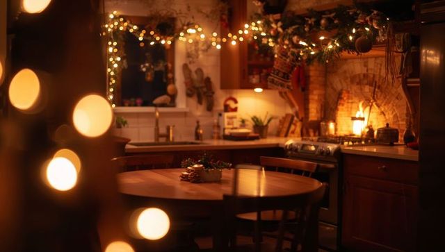 Glowing pine garland with warm fairy lights on dark backdrop for festive minimalist design