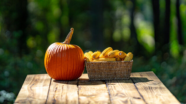 Pumpkins and corn on wooden table during autumn harvest. Organic pumpkin produce from farm. Raw pumpkin harvest with natural background. Farm fresh pumpkins with rustic wooden surface.