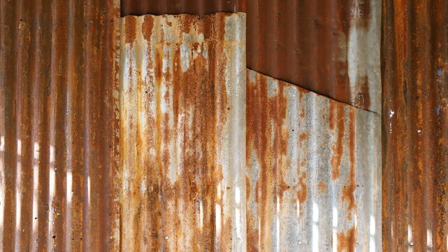 Rusted zinc wall background. The abstract texture of the vintage rustic style galvanized metal wall is sunny. Selective focus