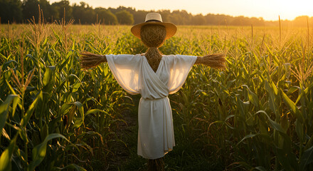 Rustic scarecrow guarding cornfield at sunset