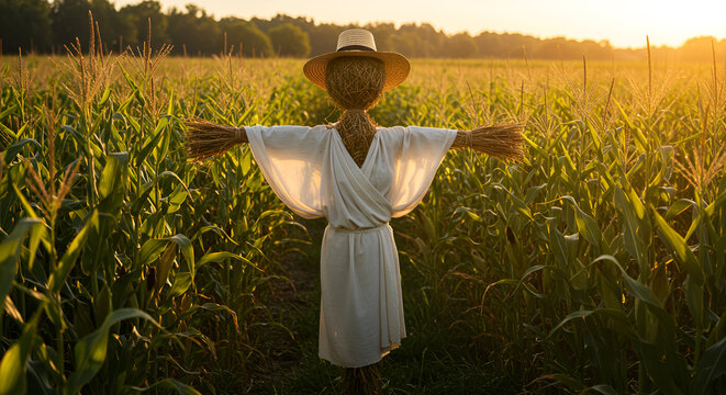 A scarecrow stands in the midst of a cornfield, silhouetted against a dramatic sunset sky. The scarecrow is wearing a hat and has outstretched arms, with a skeletal face. Three crows are prominently f