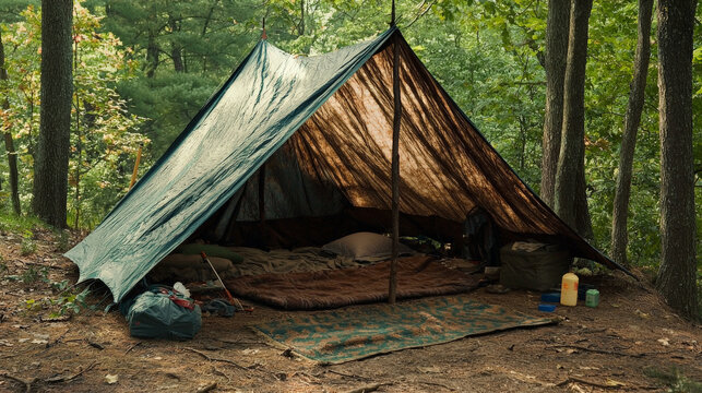 Autumnal Woodland Shelter: Sunlight Dapples Golden Leaves on Rustic Lean-to in Forest