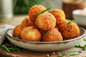 A rustic plate of traditional Dutch bitterballen, a bitesized meat and gravy croquette served as a snack in bars.