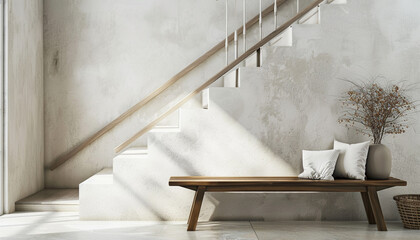 Wooden bench against grey wall and staircase. Scandinavian, rustic farmhouse interior design of modern