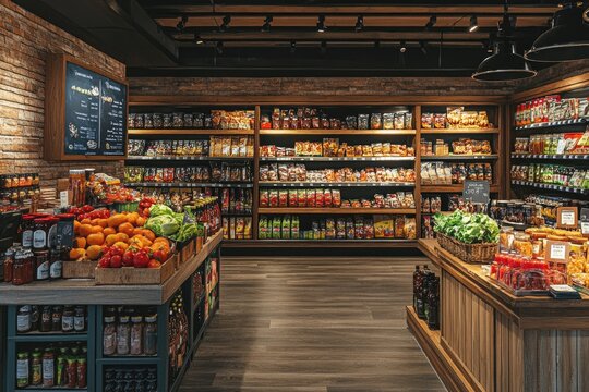 A well-stocked grocery store with shelves full of food. This image is perfect for a website or advertisement for a grocery store or food retailer.