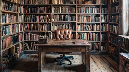 A vintage collection of books set in a rustic wooden bookshelf, adorned with classic objects, creating a nostalgic and intellectual atmosphere in a study room.