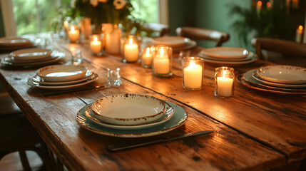 Romantic holiday table setting with candles, flowers, and tableware on a rustic wooden background