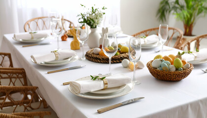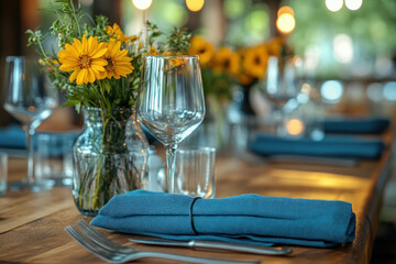 Rustic charm table setting with fresh daisies and elegant glassware capturing a serene ambiance and natural light