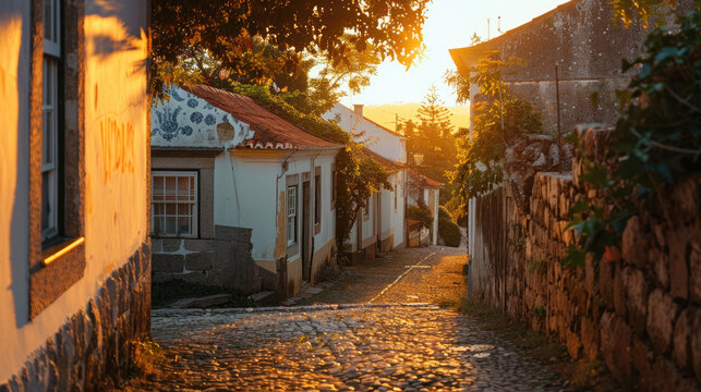 Narrow cobblestone alley flanked by rustic houses bathed in warm, golden sunlight; trees and foliage cast intricate shadows, creating a serene atmosphere.