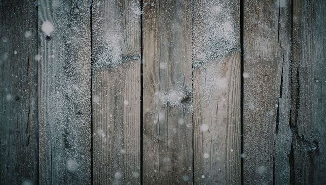 Weathered wooden planks dusting with snow and falling flakes winter texture background