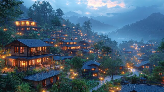 Peaceful mountain village at dusk glowing windows create warm, inviting atmosphere