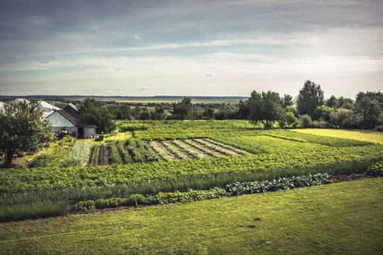 Agricultural farm countryside landscape and cultivated kitchen garden on farmer's vegetable garden summer scenery