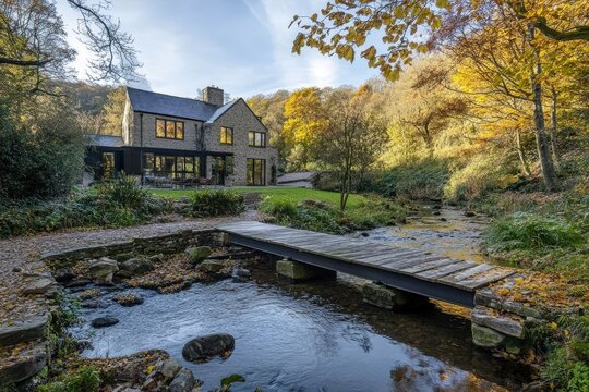Rustic Wooden Bridge Over Tranquil Stream, Surrounded by Autumn Trees, Weathered Planks Aglow with Vibrant Fall Colors