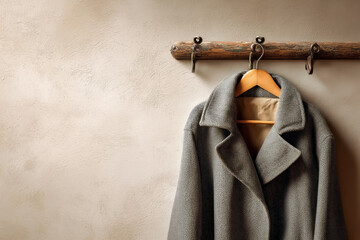 Stylish gray coat hanging on a rustic wooden hanger.