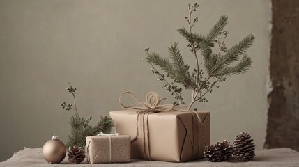 Elegant christmas decor with lit candles and wrapped gift on rustic table