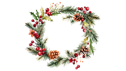 Green pine wreath decorated with pinecones and red berries on a white background.  PNG transparent.