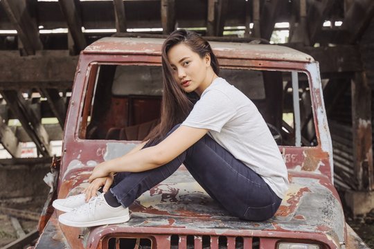 Old rusty white car with damaged paintwork on bumper and hood. Rusted ,cracked and peeling clear coat on top of vehicle bonnet hood. Car body deterioration and rust. Fragment of car hood with rust.