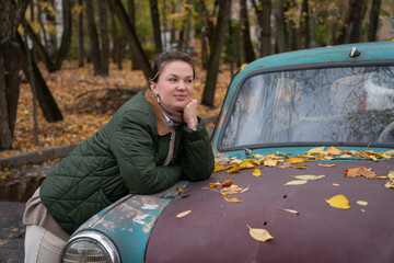 Smiling woman leans on the hood of a rusty vintage car covered with yellow autumn leaves, surrounded by a quiet forest with warm fall tones