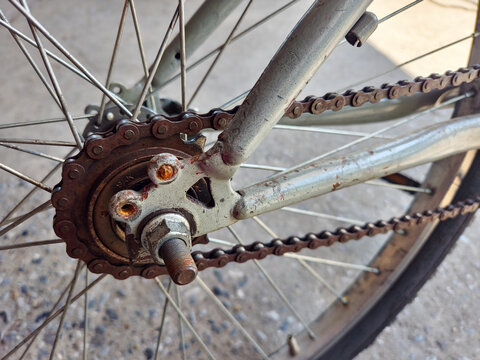 Close up of a rusty bicycle chain covered in dust showing its age and need for maintenance