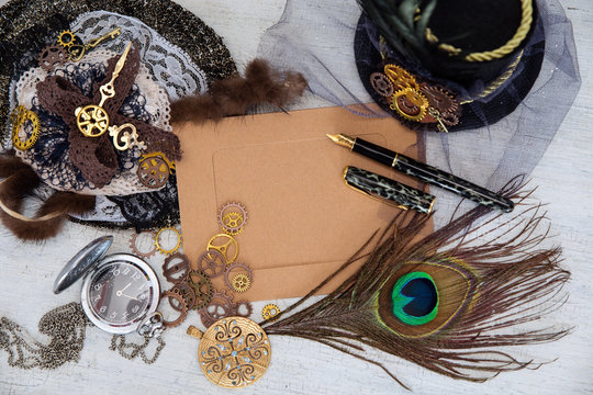 Antique key with clockworks. Escape room game, time background.