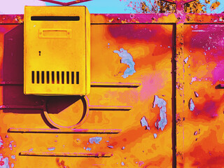 Vibrant old golden yellow metal gate with a striking mailbox background
