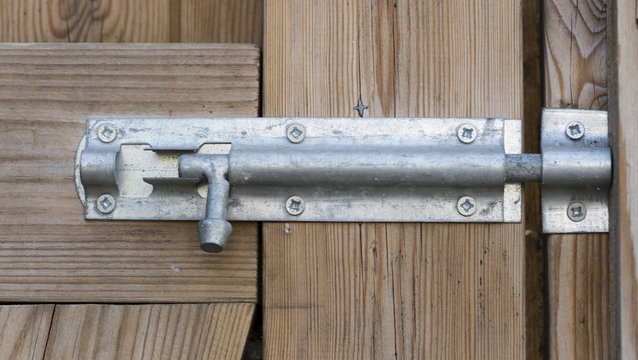 Old gold steel lock and damaged and rusted steel door on wooden door. Locked on wooden door with old steel metal shutter and folding door gate. Old wooden door with locked key. Vintage background.
