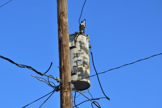 Isolated closeup of generic old rusty electric transformer on pole to signify the aging power grid