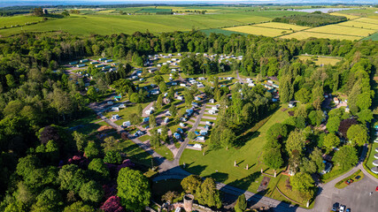 Aerial view of green countryside with village, Hoddom Castle Caravan Park, Lockerbie, Scotland.