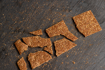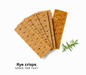 Slices of healthy low calories grain crisp bread for snack and crumbs on white background.