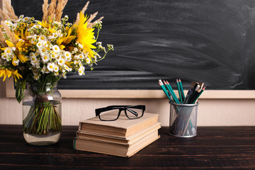 Teacher's day background. Black chalk board empty copy space and fresh wildflowers in vase. Holiday feminine poster.Spring greeting 8 march icon.