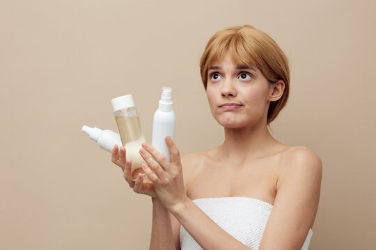 a funny, thoughtful woman stands on a beige background holding jars of care cosmetics in her hands and looks sadly away. Horizontal photo with empty space