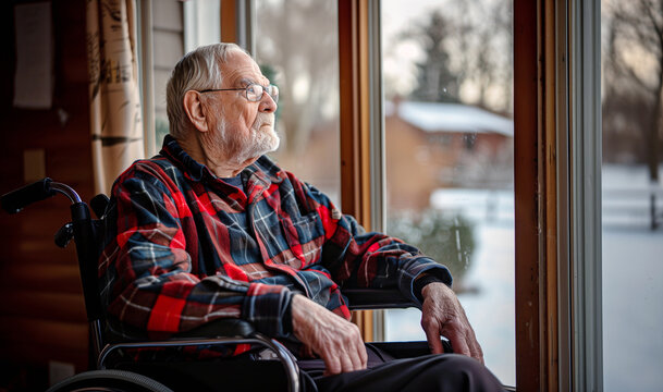 Older retired man sitting in Wheelchair and sadly looking out the window. Health care and medical old people support concept image.