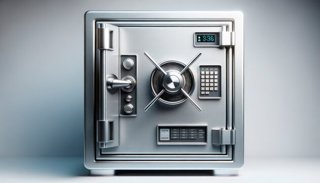 Metal safe with a combination lock on a gray background. Generative AI