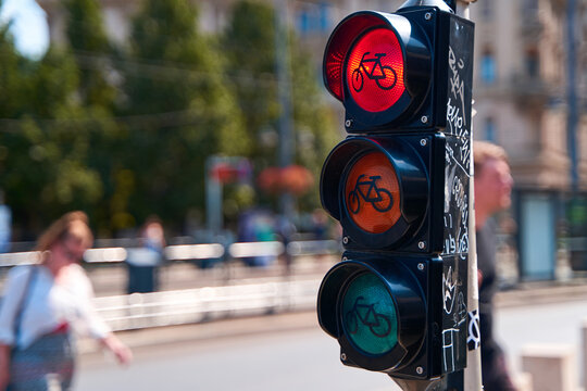 Close-up of a traffic light for cyclists, which is lit in red. A bicycle is shown on the traffic light