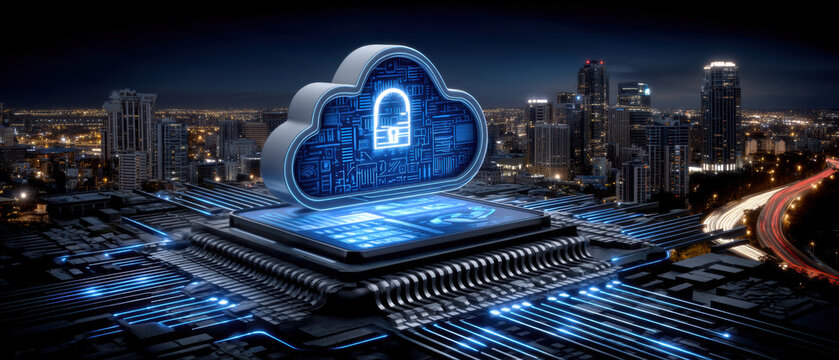 Secure cloud cybersecurity concept glowing lock above microchip cityscape at night futuristic data protection feeling safe