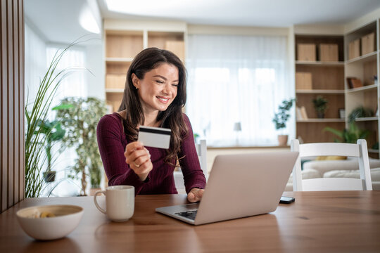 Secure online payments. Smiling gen z female customer sit on couch paying in ecommerce shop using credit card on smartphone book tickets via online service make cashless transaction through e-bank app