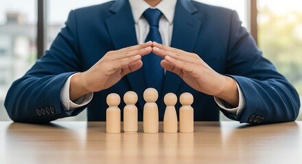 Woman holding her hands in the form of a roof over the figurines of a family.