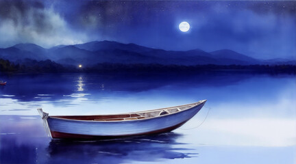 Boat on the lake watercolor oil painting wallpaper background at night by Generative AI