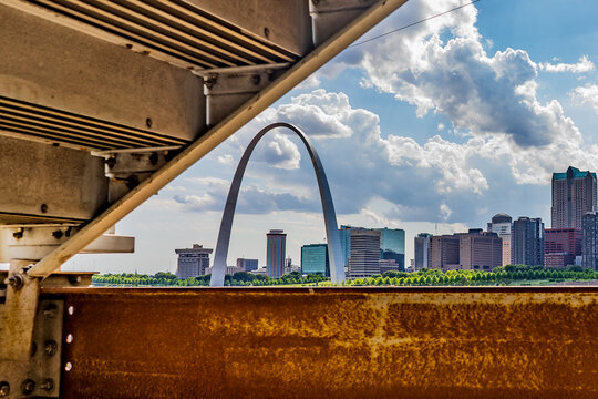 MAY 13 2019, ST LOUIS, MO., USA - St. Louis, Missouri skyline on Mississippi River - shot from East St. Louis, Illinois