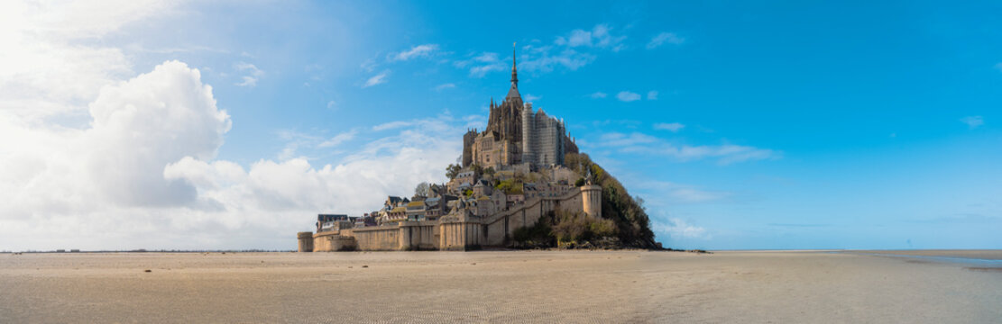 Beautiful panoramic view of famous Le Mont Saint-Michel tidal island with blue sky. Normandy, northern France