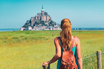 Woman tourist looking at famous site of Mont Saint Michel, France