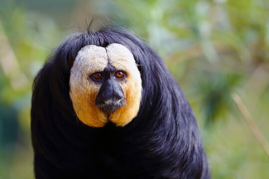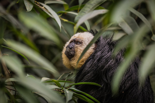 Saki monkey - Pithecia pithecia portrait. They live in the trees of a south american rain forests. Endangered animal in a wilderness. Wildlife photography.