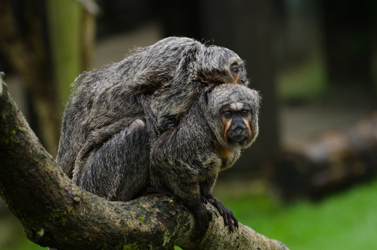 In the lush Amazon canopy, a saki monkey mother watches over her infant as it takes its first leaps